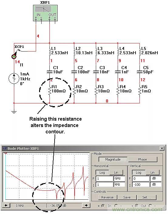 5個阻抗零點和4個阻抗峰值都受到電阻值的影響,圖3提供了一個范例。請注意,并聯諧振頻率本身不能完全消除,將永遠存在,你必須考慮到這一點。