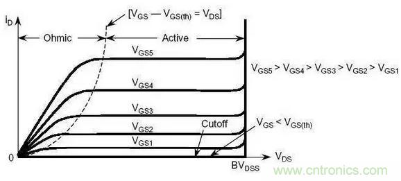該參數反映了器件可以處理的脈沖電流的高低,脈沖電流要遠高于連續的直流電流。定義IDM的目的在于:線的歐姆區。對于一定的柵-源電壓,MOSFET導通后,存在最大的漏極電流。如圖所示,對于給定的一個柵-源電壓,如果工作點位于線性區域內,漏極電流的增大會提高漏-源電壓,由此增大導通損耗。長時間工作在大功率之下,將導致器件失效。因此,在典型柵極驅動電壓下,需要將額定IDM設定在區域之下。區域的分界點在Vgs和曲線相交點。
