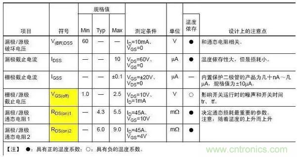 VGS(th)是指加的柵源電壓能使漏極開始有電流,或關斷MOSFET時電流消失時的電壓,測試的條件(漏極電流,漏源電壓,結溫)也是有規格的。正常情況下,所有的MOS柵極器件的閾值電壓都會有所不同。因此,VGS(th)的變化范圍是規定好的。VGS(th)是負溫度系數,當溫度上升時,MOSFET將會在比較低的柵源電壓下開啟。