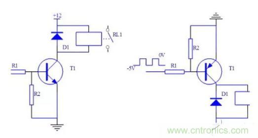 電路中各元器件的作用:晶體管T1為控制開關;電阻R1主要起限流作用,降低晶體管T1功耗;電阻R2使晶體管T1可靠截止;二極管D1反向續流,為三極管由導通轉向關斷時為繼電器線圈中的提供泄放通路,并將其電壓箝位在+12V上。