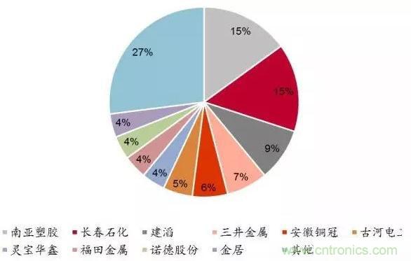 銅箔生產行業集中度高,行業龍頭議價能力強。PCB生產所使用的銅箔主要采用電解法制成,電解銅箔的工藝流程較長,加工要求嚴格,存在資本和技術壁壘,歷經數次整合后行業集中度較高,全球銅箔前十大生產商占據73%的產量,對整個銅箔行業的議價能力較強,上游原材料銅的漲價可向下轉移。銅箔價格影響覆銅板價格,進而向下引起線路板價格變化。