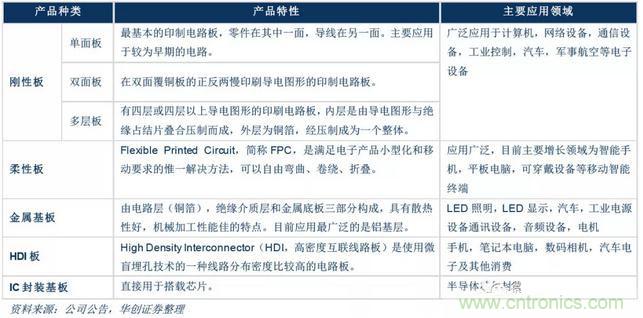 PCB 主要分為剛性板(單面板/雙面板/多層板),柔性板,HDI 基板,IC 封裝基板以及金屬基板。