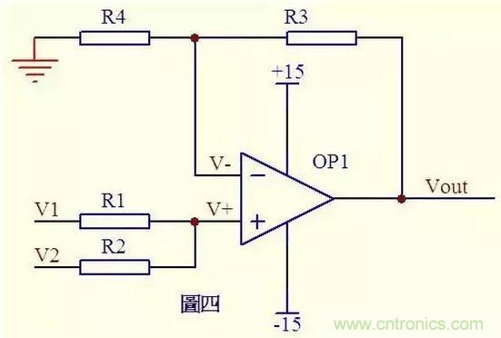 請(qǐng)看圖四。因?yàn)樘摂啵\(yùn)放同向端沒(méi)有電流流過(guò),則流過(guò)R1和R2的電流相等,同理流過(guò)R4和R3的電流也相等。故 (V1 – V+)/R1 = (V+ - V2)/R2 ……a (Vout – V-)/R3 = V-/R4 ……b 由虛短知: V+ = V- ……c 如果R1=R2,R3=R4,則由以上式子可以推導(dǎo)出 V+ = (V1 + V2)/2 V- = Vout/2 故 Vout = V1 + V2 也是一個(gè)加法器。