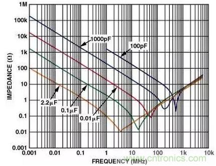并聯不同的電容值的電容器有助于確保電源引腳在很寬的頻帶上只能看到很低的交流(AC)阻抗。這對于在運算放大器電源抑制比(PSR)衰減頻率處尤其重要。該電容器有助于補償放大器降低的PSR。在許多十倍頻程范圍內保持低阻抗的接地通路將有助于確保有害的噪聲不能進入運算放大器。圖1示出了采用多個并聯電容器的優點。在低頻段,大的電容器提供低阻抗的接地通路。但是一旦頻率達到了它們自身的諧振頻率,電容器的容性就會減弱,并且逐漸呈現出感性。這就是為什么采用多個電容器是很重要的原因:當一個電容器的頻率響應開始下降時,另一個電容器的頻率響應開始其作用,所以能在許多十倍頻程范圍內保持很低的AC阻抗。