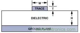H表示從接地平面到信號印制線之間的距離,W表示印制線寬度,T表示印制線厚度;全部尺寸均以密耳(mils)(10-3英寸)為單位。εr表示PCB材料的介電常數。