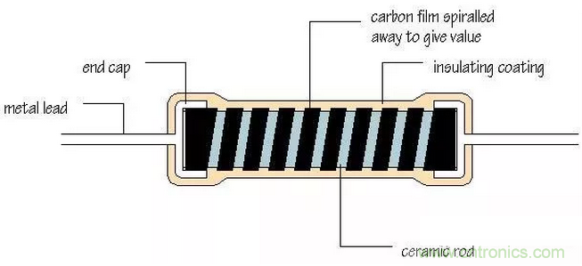 碳膜電阻主要是在陶瓷棒上形成一層碳混合物膜,例如直接涂一層,碳膜的厚度和其中碳濃度可以控制電阻的大?。粸榱烁泳_的控制電阻,可以在碳膜上加工出螺旋溝槽,螺旋越多電阻越大;最后加金屬引線,樹脂封裝成型。碳膜電阻的工藝更加復雜一點,可以做精密電阻,但由于碳質的原因,還是溫度特性不太好。