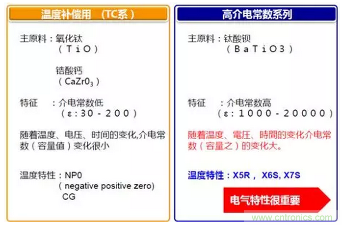 目前主流的陶瓷電容分類主要是按材質來分,不同的材質,會有不同的容值,有不同的溫度系數。目前主要有以下材質:X5R,X7R,C0G,NP0,X6S,X7T等,這些又可以分兩大類,溫度補償型和高介電常數,主要是溫度系數不同,溫度補償型主要是容值隨溫度變化小,但是容值做不高。高介電常數型,溫度系數不好,但是容值可以做的比較高。