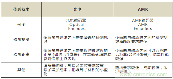 與傳統光學傳感技術比較,AMR技術可提供較小巧的外觀、低成本,并且更適合在惡劣環境下工作,例如骯臟及溫度變化的工作環境中。表1列舉了兩者之間的比較,從中可以明顯看出在無刷直流電機中使用AMR的優點。