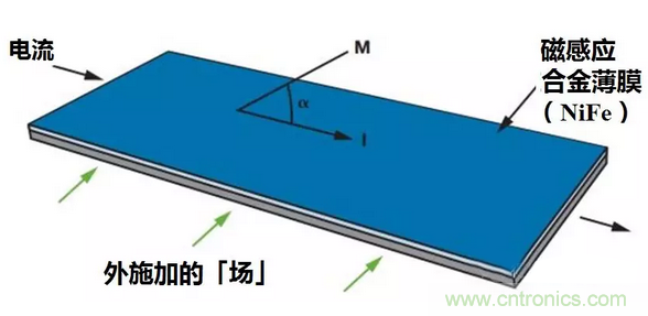 基于AMR原理的傳感器的材料電阻率取決于相對于電流方向的磁化方向。AMR傳感器是在磁飽和狀態下工作,因此外加的磁場的主導了電阻變化。當外磁場和電流方向平行時,電阻最大;而當施加的電場垂直于載流磁感應合金的平面時,電阻最小。圖1顯示了AMR傳感器工作原理的簡化圖。
