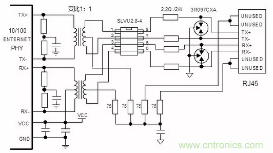 注意,TVS管的寄生電容可能影響信號完整性,可以使用壓敏電阻放在變壓器抽頭,作為防護電路,支持更高速率的網口設計。