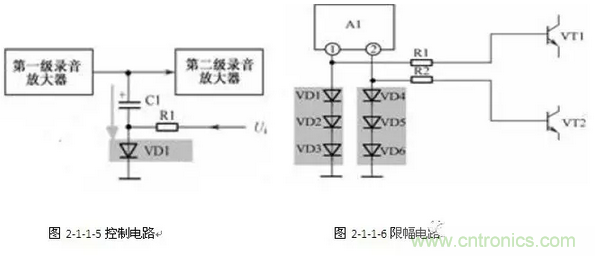 二極管導通之后,它的正向電阻大小隨電流大小變化而有微小改變,正向電流愈大,正向電阻愈小;反之則大。利用二極管正向電流與正向電阻之間的特性,可以構成一些自動控制電路。如圖9-43所示是一種由二極管構成的自動控制電路,又稱ALC電路(自動電平控制電路),它在磁性錄音設備中(如卡座)的錄音電路中經常應用。圖2-1-1-5。