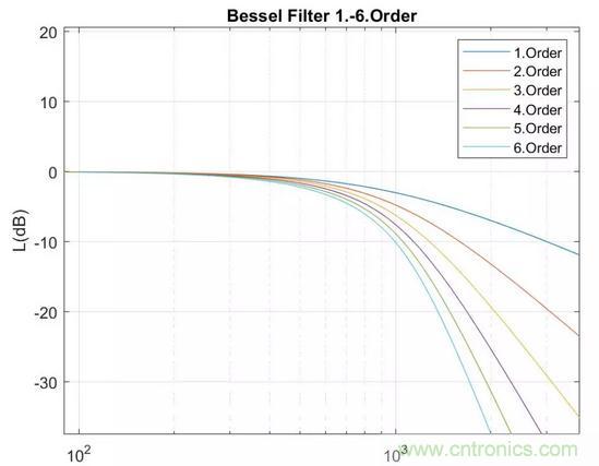1到6階截止頻率為1000Hz的bessel低通濾波器幅值特性如下圖