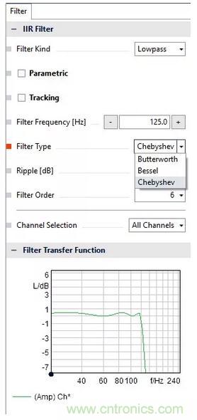 有三種IIR濾波器可供選擇,分別為切比雪夫I型、貝塞爾以及巴特沃斯濾波器。對于不同類型的濾波器可自定義參數。比如對于巴特沃斯濾波器需要定義截止頻率和濾波器階數,如果是帶通或者帶阻,還需要確定通帶/阻帶帶寬;如果是切比雪夫濾波器的話,還需要確定波動值。
