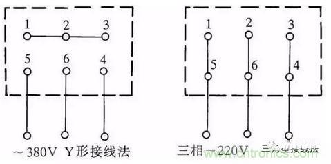 有部分三相吹風機有6個接線端子,接線方法如圖2所示。采用△形接法應接入220V三相交流電源,采用Y形接法應接入380V三相交流電源。一般3英寸、3.5英寸、4英寸、4.5英寸的型號按此法接。其他吹風機應按其銘牌上所標的接法連接。