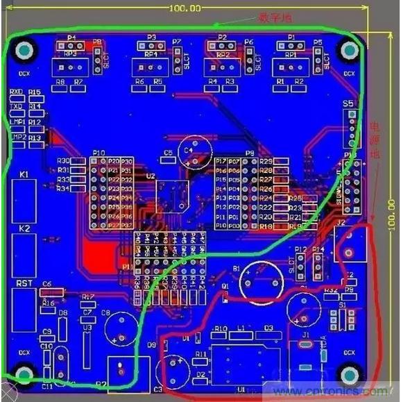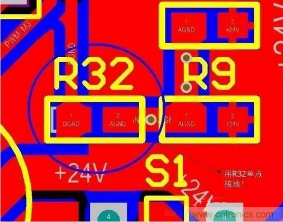 從此圖可以看出:只在電源地和數字地之間用一個0歐電阻或磁珠之類的單點接地就行了,同樣單點接地的位置應該盡量靠近板子電源地的入口(起始位置)。