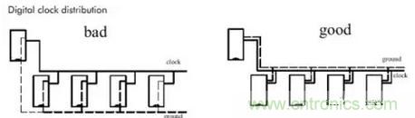 對(duì)應(yīng)地線回路規(guī)則,實(shí)際上也是為了盡量減小信號(hào)的回路面積,多見(jiàn)于一些比較重要的信號(hào),如時(shí)鐘信號(hào),同步信號(hào);對(duì)一些特別重要,頻率特別高的信號(hào),應(yīng)該考慮采用銅軸電纜屏蔽結(jié)構(gòu)設(shè)計(jì),即將所布的線上下左右用地線隔離,而且還要考慮好如何有效的讓屏蔽地與實(shí)際地平面有效結(jié)合。