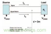 圖1:電路回路中的共模電流。電路中的源是一個數字信號(帶諧波),其負載被假定為阻性。因為遠端導線上的相電流和近端導線上的相電流的流向是相同的,所以其合成相量相較于差模電流產生的相量會更大。在這種情況下,為了限制輻射發射的水平,降低諧波成分的大?。p慢數字信號的上升/下降時間)或者轉移/限制共模電流是非常重要的。
