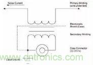 射頻電流探頭是一個初級類型為插入式的射頻電流變壓器。即,當我們將探頭夾在待測電流流經的導線或者電纜上的時候,這些導體就構成了變壓器的初級線圈。這種探頭的夾合特性使得它很容易被安置在任意導體或者電纜的四周。其本質就是一個寬帶的高頻變壓器。利用電流探頭,可以在不對電路造成物理影響的情況下,實現對電纜上的高頻電流的測量。既然打算將電流探頭夾合在導線上,那么如圖2 所示的變壓器初級實際上就是待測共模電流流過的電導體本身。另外,因為共模電流被認為是流過導體后,再經過回流導體(例如:框架,共地面或者接地)返回到電源的,所以這個變壓器的初級線圈通常被認為只有一匝。在某些電流探頭的模型中,次級輸出端內部接的是阻性負載,這樣可以在一個很寬的頻率范圍內提供非常穩定的轉移阻抗。