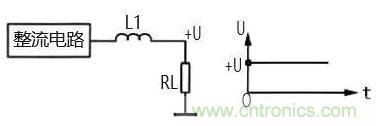 圖 3 所示是電感濾波原理圖。由于電感 L1 對(duì)直流 電相當(dāng)于通路,這樣整流電路輸出的直流電壓直接加 到負(fù)載 RL 上。