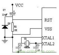在內部方式時鐘電路中,必須在XTAL1和XTAL2引腳兩端跨接石英晶體振蕩器和兩個微調電容構成振蕩電路,通常C1和C2一般取30pF,晶振的頻率取值在1.2MHz~12MHz之間。對于外接時鐘電路,要求XTAL1接地,XTAL2腳接外部時鐘,對于外部時鐘信號并無特殊要求,只要保證一定的脈沖寬度,時鐘頻率低于12MHz即可。