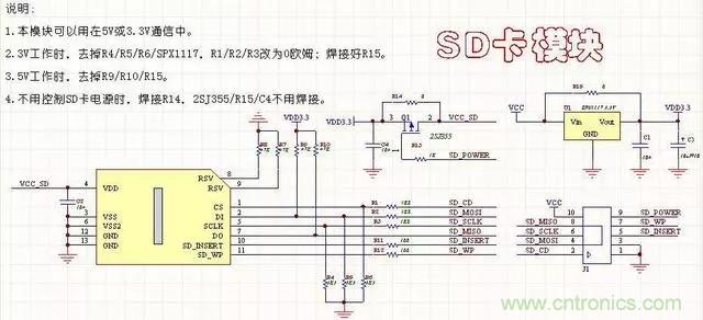 6、SD卡模塊電路(帶鎖)本電路與SD卡的封裝有關,注意與封裝對應。此電路可以通過端口控制SD卡的電源,比較完善,可以用于5V和3.3V。但是要注意,有些器件的使用,5V和3.3是不一樣的。