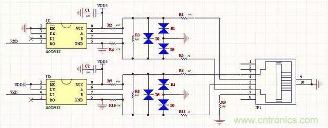 9、全雙工RS485電路(帶保護功能)帶有保護功能,全雙工4線通信模式,適合遠距離通信用。