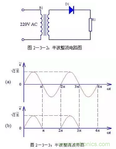 半波整流電路見圖2-3-2。其中B1是電源變壓器,D1是整流二極管,R1是負載。B1次級是一個方向和大小隨時間變化的正弦波電壓,波形如圖 2-3-3(a)所示。0~π期間是這個電壓的正半周,這時B1次級上端為正下端為負,二極管D1正向導通,電源電壓加到負載R1上,負載R1中有電流通過;π~2π期間是這個電壓的負半周,這時B1次級上端為負下端為正,二極管D1反向截止,沒有電壓加到負載R1上,負載R1中沒有電流通過。在 2π~3π、3π~4π等后續周期中重復上述過程,這樣電源負半周的波形被“削”掉,得到一個單一方向的電壓,波形如圖2-3-3(b)所示。由于這樣得到的電壓波形大小還是隨時間變化,我們稱其為脈動直流。