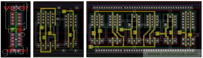 對于標準單元的版圖,根據(jù)工藝要求,標準邏輯單元的高度是固定的,寬度為最小單元寬度的公約數(shù)倍數(shù),例如在圖3中,左圖為反向器(inverter,INV)的版圖,中圖為選擇器(multiplexer,MUX)的版圖,右圖為D型寄存器的(D-Flip Flop, DFF)的版圖。如上所述,從版圖設(shè)計中,可以導出并建立GDSII和LEF文件。GDSII文件經(jīng)過設(shè)計簽核(design sign-off)過程由代工廠使用于芯片制造,LEF文件用于全芯片的P&R物理設(shè)計。