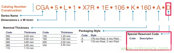 對于TDK的汽車級CGA系列的電容來說,環氧樹脂安裝的電容只在后綴上以一個字母"D"表示,這一般定義為“TDK內部代碼”,并可以有其他字母如“A”、“B”、“C”、“E”等。
