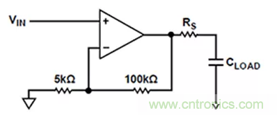 為解決這一問題,運算放大器設(shè)計人員提出了一種解決方案:在放大器輸出端與CLoad引腳之間加裝串聯(lián)電阻器,使器件能夠驅(qū)動大于1微法 (µF) 的負載(圖2)