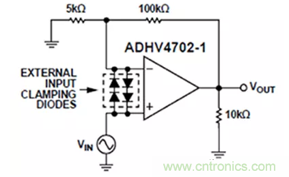 圖9:在ADHV4702-1輸入端接入外部二極管,可通過限制該器件的差分輸入電壓,保護其不受升壓電路大電流產(chǎn)生的熱效應(yīng)影響。(圖片來源:Analog Devices)
