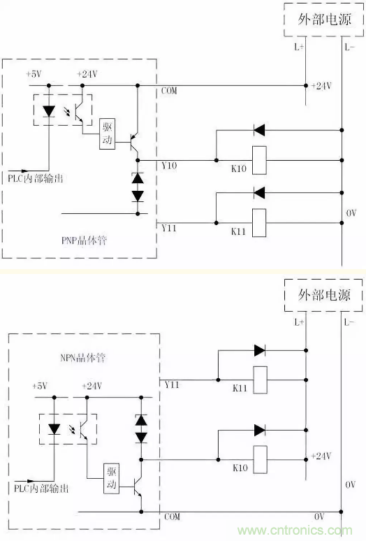 由以上兩圖可看出這兩種晶體管輸出電路形式的區別:NPN型集電極開路輸出形式的公共端COM只能接外接電源的負極,而PNP型的COM端只能接外接電源的正極。