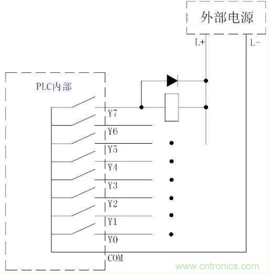 和繼電器輸出形式電路一樣,在驅動感性負載時也要在負載兩端反向并聯二極管(二極管的陰極接電源的正極)防止過電壓,保護PLC的輸出電路。