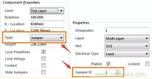 首先創(chuàng)建一個腳印,通常,跳線是以預先定義的長度設計的,例如以0.1英寸(100毫秒)的增量來設計。如前所述,有兩個條件需滿足:1.跳線中的兩個焊盤必須具有設置為相同、非零值的跳線ID。注意:主板設計中使用的所有跳線示意圖中的焊盤是否具有相同的跳線ID值。2.跳線部件必須具有其類型設置為跳線。只有在將Footprint放置到PCB工作區(qū)中之后才能設置此選項,它無法在PCB Library Editor中設置。