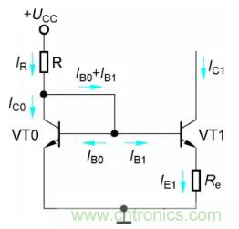 與典型的靜態工作點穩定電路一樣,Re0和Re1是電流負反饋電阻,因此與鏡像恒流源電路相比,比例恒流源的輸出電流IC1具有更高的穩定性。