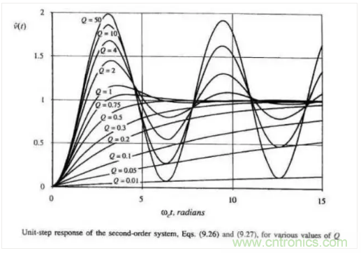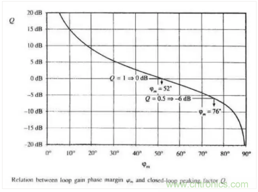 所以環路要留一定的相位裕量,如圖Q=1時輸出是表現最好的,所以相位裕量的最佳值為52度左右,工程上一般取45度以上.如下圖所示: