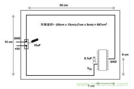 在圖3此單面板中,到電路板上器件的電源線和地線彼此靠近。此電路板中電源線和地線的配合比圖2中恰當。電路板中電子元器件和線路受電磁干擾(EMI)的可能性降低了679/12.8倍或約54倍。