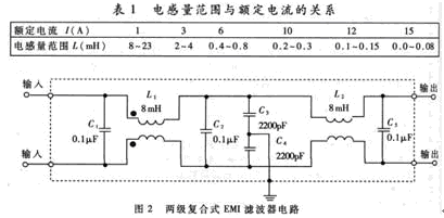 需要指出,當額定電流較大時,共模扼流圈的線徑也要相應增大,以便能承受較大的電流。此外,適當增加電感量,可改善低頻衰減特性。C1和C2采用薄膜電容器,容量范圍大致是0.01Μf~0.47μF,主要用來濾除串模干擾。C3和C4跨接在輸出端,并將電容器的中點接地,能有效地抑制共模干擾。C3和C4亦可并聯在輸入端,仍選用陶瓷電容,容量范圍是2200Pf~0.1μF。為減小漏電流,電容量不得超過0.1μF,并且電容器中點應與大地接通。C1~C4的耐壓值均為630VDC或250VAC。圖2示出一種兩級復合式EMI濾波器的內部電路,由于采用兩級(亦稱兩節)濾波,因此濾除噪聲的效果更佳。針對某些用戶現場存在重復頻率為幾千赫茲的快速瞬態群脈沖干擾的問題,國內外還開發出群脈沖濾波器(亦稱群脈沖對抗器),能對上述干擾起到抑制作用。