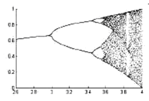 把u做為分叉參數,由分叉理論可知,當u=3和 時系統分別產生周期2和周期4不動點。系統發生混沌的臨界值