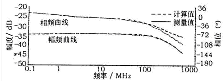 高頻范圍內的轉折頻率由測試PCB決定,主要應避免諧振的發生。為確定高頻轉折頻率,需要先測量或計算耦合網絡的傳遞函數,Philips半導體實驗室利用圖4所示的電路進行了耦合網絡傳遞函數的測量和計算,圖4中CPCB為CAN-H到搭鐵的寄生電容,經測量其值為7.5 pF,測量和計算的結果如圖5所示。將傳遞函數的計算結果與測量結果相比較,可以發現兩者非常吻合。并且由圖5可知,至少在500 MHz以內,測試電路不會受到諧振的影響。