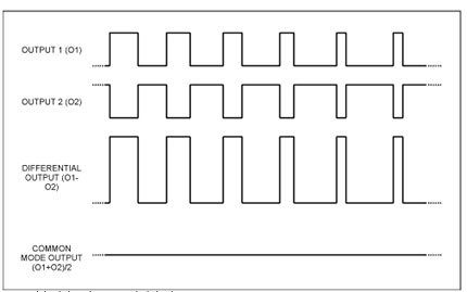 如圖1所示,如果器件的反相和同相輸出回路具有較高的匹配度,則兩個對稱輸出信號波形在揚聲器或連線上將具有很小的共模(CM)信號(底部的跡線)。注意:50%占空比代表零輸入信號(空閑狀態)。因此,可以設計一個差分低通濾波器,用于衰減信號波形中高頻分量(快速切換所產生的),同時保留有用的低頻分量以輸出到揚聲器。