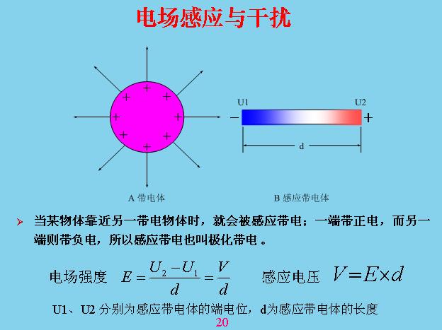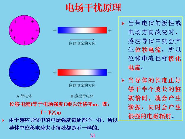電磁干擾的原理是帶電體電磨和位能不斷的改變,會對感應(yīng)體產(chǎn)生位移電流,當(dāng)這邊是正的時候,電流的方向往這邊流,當(dāng)是負(fù)的時候電流往另外一邊流。位移電流和一般電工學(xué)里面的位移電流不一樣,位移電流不需要回路,在任何一個導(dǎo)體里面都會產(chǎn)生位移電流,并且位移電流的大小在這個導(dǎo)體里面的每個地方都不一樣,不管這個怎么變化,中間位移電流等于零,只在兩端位移電流是最的大,中間那個地方等于零。如果你不好理解,你把這個當(dāng)成一根天線就理解了,天線發(fā)射電磁波的時候也是沒有回路的,就是靠不斷的對它進(jìn)行充放電,這個原理是一樣的。還有一種情況,當(dāng)兩個變換的速度和來回移動的方向、距離正好是半個波長的時候它會產(chǎn)生諧振,這個在天線理論里面可以學(xué)到。因?yàn)槲灰齐娏魇怯兴俣鹊模荒苷f速度等于無窮大,我這邊變你也變,如果移動有速度就會產(chǎn)生疊加和抵消的作用,就會產(chǎn)生諧振。