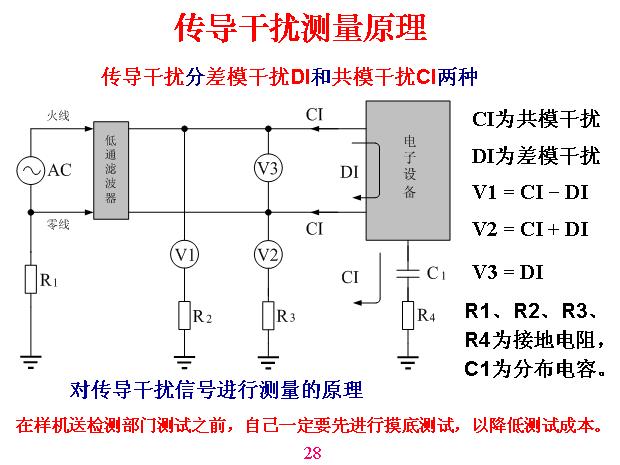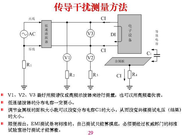 傳導(dǎo)干擾測量原理。這里面?zhèn)鲗?dǎo)干擾有兩個干擾,一個是共模,一個是差模,這樣一個回路是流進(jìn)入又流出來的,這叫做差模。這兩個同時進(jìn)去從另外一邊流出來叫共模,共模干擾很簡單,就是以大地為一端,另外一端是以上面的線路、設(shè)備,不管什么線為一端測到的電壓,這叫做共模干擾。因?yàn)闇y量的時候必須要與一根電路連接,先測三個電壓,這是測這個與大地之間的電壓,這是測兩條線之間的電壓,然后得出結(jié)算公式。V1=CI-DI,就是共模干擾減去差模干擾。V2=CI+DI,V3=DI,R1、R2、R3、R4為接地電阻,C1為分布電容,如果到檢測所去測之前自己一定要先進(jìn)行摸底測試,用一塊墊板或金屬板放在下面接地,等于說分布是固定的,利用標(biāo)準(zhǔn)一塊板與機(jī)器造成分布電容,一般是一個平方米等等,是由他們定的,你可以做試驗(yàn),測多大都沒有關(guān)系,但它是固定的,測電視機(jī)是什么樣,測手機(jī)是什么樣,這是不一樣的。傳導(dǎo)干擾測量方法。分布電容在這一塊金屬板,與它之間產(chǎn)生分布電容,當(dāng)然用這個板帶分布電容,測出來的結(jié)果數(shù)字越大,這只是用來做對比,以此為基礎(chǔ)。我們做摸底可以用大一點(diǎn)測,容易測得到,但你測得不算數(shù)。