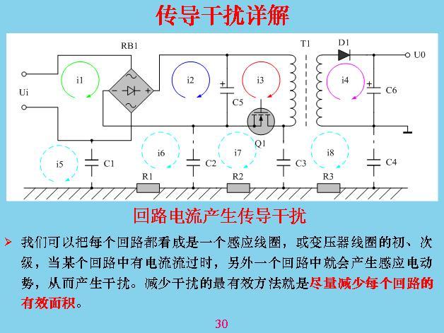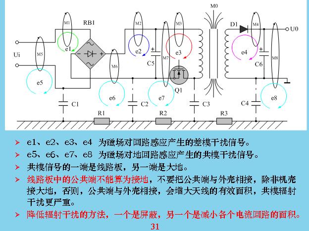 這個更加具體,有電力穿過的時候會產(chǎn)生電力線,電力線會產(chǎn)生共模干擾,這幾個都是共模干擾,那些都是差模干擾。這些干擾主要是如何產(chǎn)生的?本身線路里面只有電流流過,構(gòu)成一個線圈或?qū)Ь€都會產(chǎn)生干擾,最大的是變壓器漏感,這是其他回路的好幾十倍。所以變壓器漏感最好進(jìn)行屏蔽?怎么屏蔽呢?在線圈的外邊用一層金屬,鋁片也好,銅片也好,一般用銅片包起來,包起來應(yīng)該讓它短路,就是用焊絲焊起來,漏感在上面也會產(chǎn)生渦流,一產(chǎn)生渦流就會產(chǎn)生抵消干擾的磁場,就相當(dāng)于把漏感抵消掉。