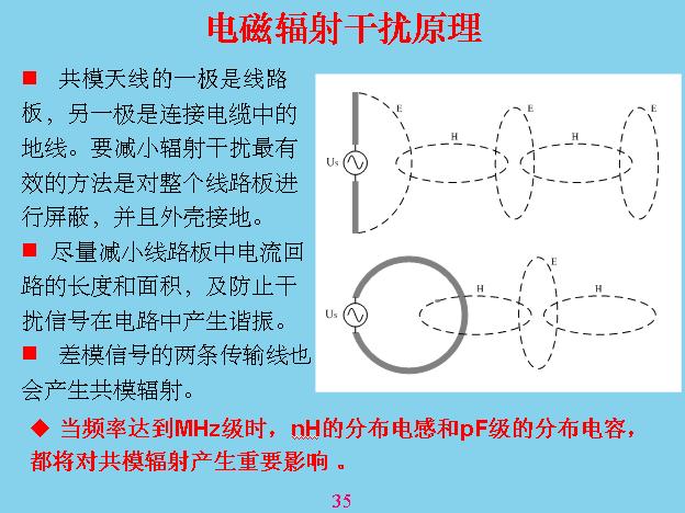 電磁輻射干擾原理。主要也是有兩種,一種是電場輻射,電場輻射最典型的就是半波陣子,如果上面這根天線的波程是半個波程,電場是最大的,現(xiàn)在一般都很少有半波程,有一段接大地,有一端作為發(fā)射天線,像中波天線就是這樣,電信天線就是半波陣子。還有一個是磁場天線,磁場天線相當(dāng)于變壓器的回路,不過這個天線有參數(shù),或者半波陣子波程最好是半個波程,根據(jù)這個波程發(fā)射,不是隨便的,長的短的效果是不一樣的。電磁輻射產(chǎn)生這兩個陣子還會充放電,一下子到正,一下子到負(fù),相當(dāng)于電容。充放電在這里會產(chǎn)生磁場,這個磁場又產(chǎn)生電阻,這就是麥格思維,不斷、不斷的傳下去,在這里面的旋度等于面積的強(qiáng)度,這就是麥格思維方程。電磁波傳播是這樣的,輻射原理主要是這個原理。