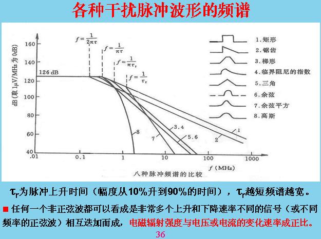 各種干擾脈沖波形的頻譜。輻射和干擾的頻率有關(guān),頻率一般都是指正弦波,這樣比較好理解,對于方波或正弦波的波形,一般我們都可以把它看成是無窮多個上升率不同的波形進(jìn)行疊加,也就是用基數(shù)展開,這是數(shù)學(xué)表達(dá)方式,比較正確是用不同的上升率,不同的波形進(jìn)行疊加,但上升率不好理解,一般都是用正旋波表示。這里面波種不同的波形,它產(chǎn)生的干擾不一樣。這種的頻譜是最寬的,這種是高新的,接近于正弦波。120dB的時候是1v,126dB就是2v,大家知道dB是什么嗎?它一般用來表示放大倍數(shù),就是輸出電壓與輸入電壓之比,取數(shù)值大于20。為什么用這個倍數(shù)來比?用倍數(shù)比相當(dāng)于把視角范圍縮小,讓你好看,如果從線性來看,一個毫伏一直到兩伏就沖到天上去了,不好看。用對數(shù)坐標(biāo)表示,越往下越壓縮,前面是壓縮比較小,這邊也是。這里變成10,變成了100,變成1000,這是在電工里面用量表示,用倍數(shù)表示,每6dB就差1倍,大家記住。這里是60÷20=3,是3個據(jù)波,這里是1000微伏,120是正極,1V+6dB=2v。到測試所去測試給一個曲線,很多人問我dB是什么意思?dB就是一個坐標(biāo),后面會加一個單位,一個毫伏0dB就是一個毫伏。功率不是20倍表示了,而是用10倍表示,每3dB差一倍功率,電壓就是每6個dB差一倍。