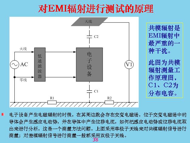 另外對于輻射干擾,我們最注意的就是共模干擾,差模干擾相對來說比共模干擾小很多,我們做過一個試驗(yàn),在同一個導(dǎo)線里面流過的電容,相差的共模干擾是2500倍。上面就是對輻射進(jìn)行測試,剛才是共模干擾,其他都是傳導(dǎo)測試,其實(shí)就是輻射干擾測試,一般就是用天線來測,天線的測試原理就是這樣的,量天線和大地之間的電壓,這個設(shè)備與大地之間有分布電容,前面已經(jīng)說過了,放這個在上面,與板接地產(chǎn)生分布電容。天線也有分布電容,分布電容不是跟設(shè)備大小和距離有關(guān),所以測試的時候都有一個標(biāo)準(zhǔn),固定設(shè)備中間距離有多遠(yuǎn),天線面積用多大,還有一套天線,很多天線,不只是一個,計(jì)最大的那個,就是測試電壓最大的那個,天線對輻射會產(chǎn)生諧振。
