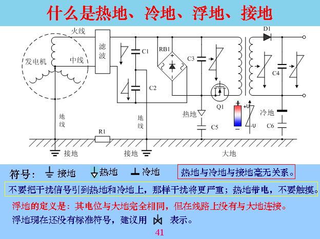 我們后面再講很具體的電路問題。很多人對地的概念不是很清楚,也不了解,現(xiàn)在很多人都把電路里面的公共關(guān)說成地,具體是不是?我們先介紹幾個概念。一般按照道理,最早地就是大地,后來地慢慢習(xí)慣用到設(shè)備里面,包括外殼、輸入線,比如說示波器或者信號線,與大地連在一起,有的不連,現(xiàn)在就變成了一個很模糊的概念,我們就把熱地、冷地、浮地、接地幾個概念簡單介紹一下。這個符號是比較標(biāo)準(zhǔn)的接地符號,就是接大地的,不管哪個設(shè)備接地都是這個符號。熱地國家還沒有標(biāo)準(zhǔn),大部分都習(xí)慣用這個箭頭作為熱地。冷地國家也沒有標(biāo)準(zhǔn),大家都接受是這樣的,這三個地基本上電工里面都有明確定義的,這個地就是接大地,熱地就是里面整流出來電源的某一端是公共端,人去摸它會帶電,會電死人,和前面的火線會產(chǎn)生回路電流,會電到人,所以這個叫做熱地。還有一個通過電子耦合以后沒有電的關(guān)聯(lián),只有磁場關(guān)聯(lián),你去量根本沒有回路,叫做冷地,手是可以摸的。但是你不要以為它是冷地就不帶電,實(shí)際上它還是帶電,為什么帶電?大家可能一下子不是很清楚,它帶的是靜電,相當(dāng)于極化帶電,就是線圈通過感應(yīng)以后,一頭帶負(fù)的,一頭帶正的。電容機(jī)也是,有一頭帶電,有一頭不帶電,這一點(diǎn)還是帶負(fù)電,不帶電的沒有跟電路連接,定位與大地一樣,所以叫做浮地。對應(yīng)的不是與大地相等,但沒有與大地連接,拿電表來量這一點(diǎn)與大地沒有電壓。浮地的信號現(xiàn)在還沒有,如果大家參考的話可以參加這個符號來用,這個地方電位等于零,當(dāng)兩邊發(fā)生變化就用這個來表,對電路分析有好處,特別是嚴(yán)重干擾的時候一定要把浮地找到,因?yàn)殡娢辉礁叩牡胤诫娙菰饺菀赘蓴_,電位等于零,也就是浮地和電位是越低的地方干擾就越小。