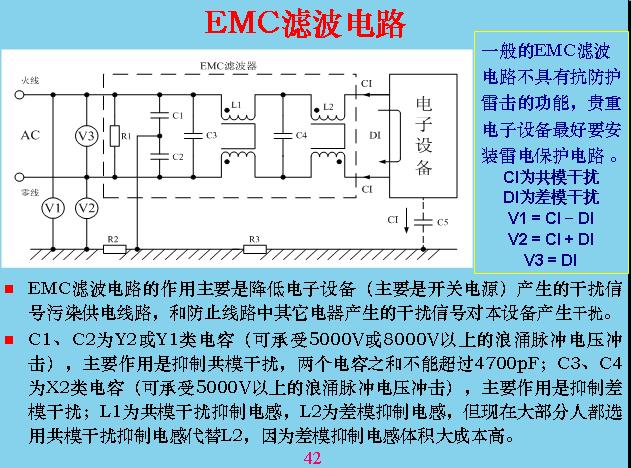 為了降低傳導(dǎo)干擾,現(xiàn)在一般在輸入電路里面都要加濾波器,這邊是設(shè)備產(chǎn)生的干擾,通過這幾個濾波以后就會把幾個電壓降低,這兩個電容是共模的濾波電容,這幾個有共模電感,也有差模電感,因?yàn)楣材k姼械捏w積比較大,成本比較高,所以大家都沒有用,都在用共模電感代替。因?yàn)楣材k姼斜旧碛新└校└袑Σ钅碚f也有抑制作用,所以相對來說用共模電感代替差模電感,成本可以大大降低。這兩個電容很關(guān)鍵,在安全里面兩個的和不能超過470b,為什么?安全測試的時候在安全設(shè)備上加2500v交流電來測與地的漏電,如果超過2.5毫安就算不合格。這樣算的話50就是2500v電壓,算出來的電壓不能超過470b。按照共模預(yù)計(jì),這兩個做得更大一點(diǎn),最大不能超過4700v。這是差模電容,差模電容沒有要求,用的越大越好。但是用得越大也有一個問題,把電容線拔掉的時候上面帶電不能超過,所以這里必須加一個放電電阻,這邊大的以后也可以加一個放電電阻,充電拔掉以后,下面人不能摸,會電到人,所以用放電電阻把它放掉。