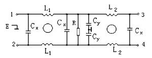 圖2為高性能的EMI濾波器。其中,E表示共模信號輸入端。圖2中網(wǎng)絡(luò)的共模等效電路如圖3(a)所示,差模等效電路如圖3(b)所示。圖3(b)中Le1、Le2、Cxi,i=1,2,3,分別表示等效電感和電容。